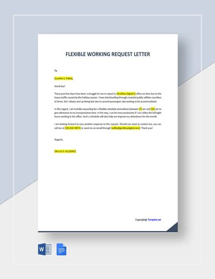 Flexible Working Request Template - Download a free template letter to make a statutory flexible working request to your employer. Learn how to make a statutory request for flexible working with this letter template and tips. Learn how to personalise the letter and what to include in it. I propose to have the flexibility to adjust my daily working hours. Download a basic template (free).
